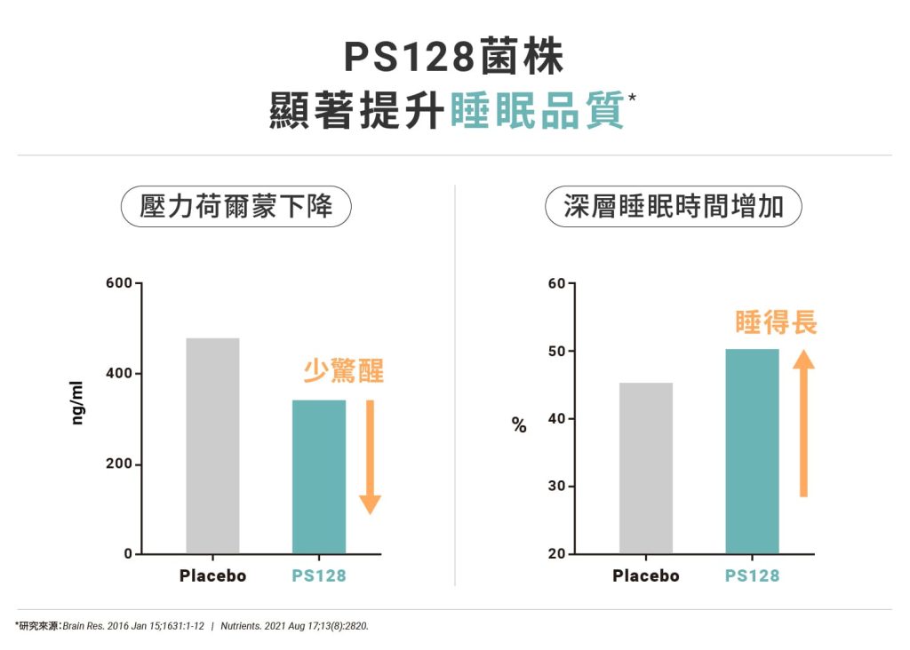 在功能性益生菌研究中,植物乳桿菌 PS128 (Lactiplantibacillus plantarum PS128) 是少數經過「隨機、雙盲、對照臨床試驗(RCT)」證實能調節腸腦軸線(Gut-Brain Axis)的菌株。其研究結果顯示,補充 PS128 對改善失眠患者的睡眠結構與生理調節具有顯著效益。