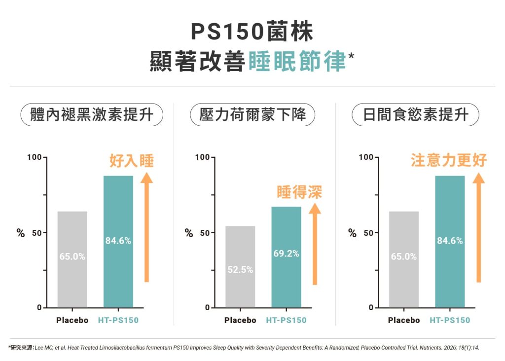 根據 2026 年發表於國際頂級學術期刊 Nutrients》(Q1 分區) 的最新「隨機雙盲對照臨床試驗(RCT)」,發酵乳桿菌 PS150 (Lacticaseibacillus paracasei PS150) 在改善中度失眠與生理時鐘失調方面展現了顯著效益。研究結果顯示,超過 8 成的中度失眠受試者在連續服用 PS150 八週後,其體內生理指標與睡眠心理狀態得到全方位優化。